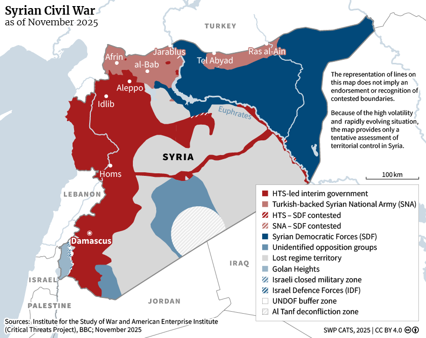 Under Assad, Hayat Tahrir al-Sham (HTS), which originally emerged from jihadist networks in Syria, had long been the dominant force in Idlib, a position made possible by Turkey’s military posture and political protection in the northwest. When the Assad regime eventually collapsed – as a result of internal decay and the inability of its key external backers (notably Iran, Hezbollah, and Russia, which had grown weak owing to the war in Ukraine) to continue providing support – HTS capitalised on the power vacuum that ensued. Building on the administrative and military structures it had developed in Idlib, the group expanded its reach southward and, on 8 December 2024, took control of Damascus. However, it does not have full control over a vast but sparsely populated region to the east (marked as “lost regime territory” on the map above) and thus has been unable to fully consolidate its post-regime change territorial reach. HTS leader Ahmed al-Sharra now serves as Syria’s interim president. Although the new authorities have achieved a degree of internal and external recognition, the country remains significantly weakened after more than a decade of civil war, while governance is characterised by institutional fragility and the enormous challenge of rebuilding a state that had failed to deliver most basic services.