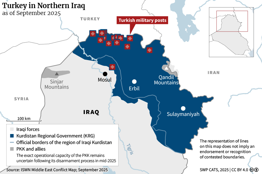 In October 2024, Ankara launched a new peace initiative under which the PKK announced a unilateral cease-fire and declared its intention to disarm and disband. While the outcome of this process remains uncertain and there are significant doubts about whether it will continue, cross-border Turkish military operations in northern Iraq appear to have ceased for the time being. Turkey’s network of military bases in the region remains in place, however.
