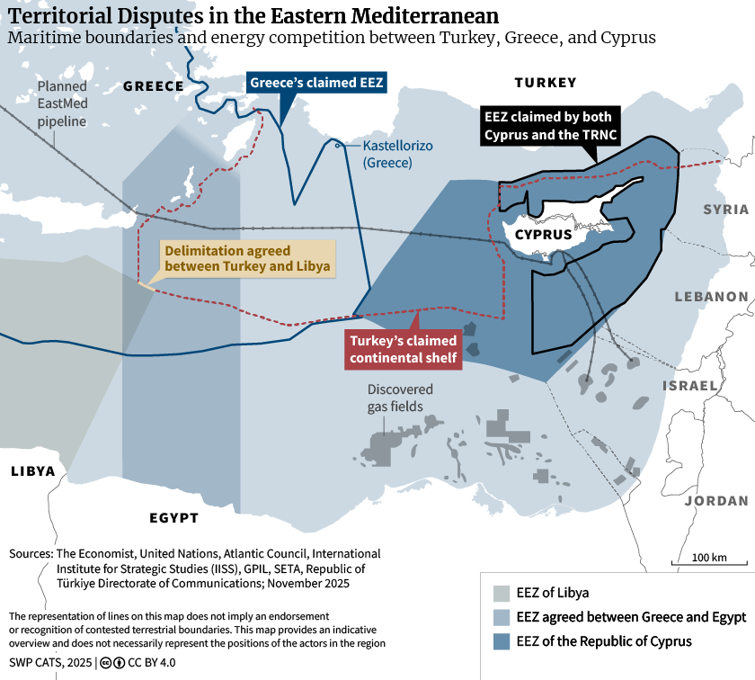 Turkey contests the maritime boundaries claimed by Greece and the Republic of Cyprus, arguing that islands – particularly small and remote ones such as Kastellorizo – should not enjoy full EEZ or continental shelf rights. Turkey’s own claimed continental shelf partly overlaps with the EEZs that Cyprus has delineated in agreements with Egypt and Israel.