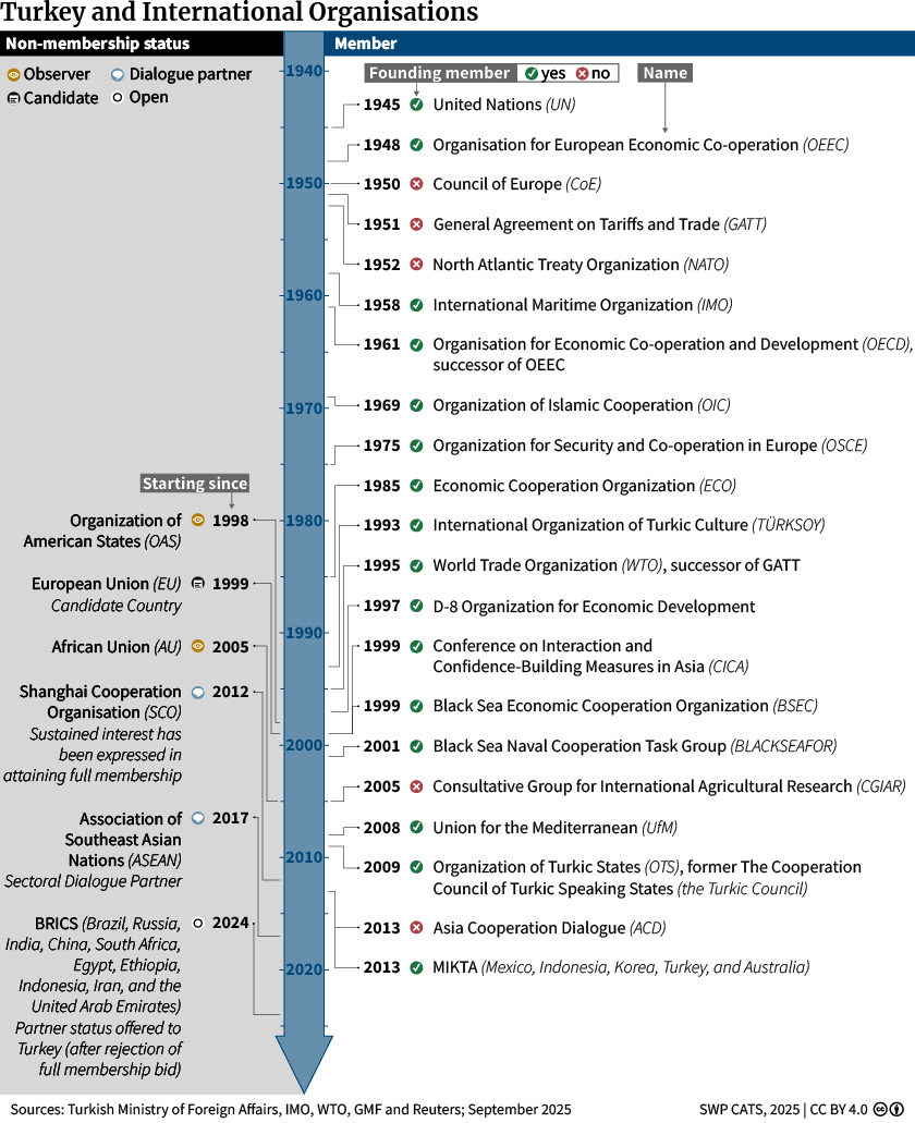 This visual platform provides an overview of Turkey’s evolving foreign policy activism. It combines maps, charts, and short explanatory texts to illustrate Turkey’s capabilities, tools, and areas of engagement and to show how the various instruments are deployed by the country’s decision-makers. The aim is to offer an accessible, structured summary of Turkey’s increasingly multidimensional foreign policy. This visualisation is an update of the one first published in 2020 and subsequently updated in 2021. It reflects the regional and global shifts that have taken place over the past four years.